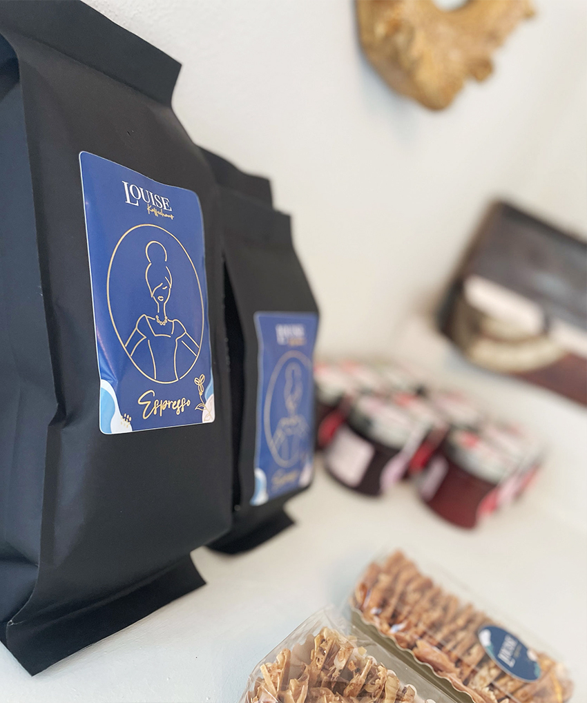 Wir verwöhnen Sie mit Espressobohnen in der „Louise-Edition“ von Barista Rebel, die wir Ihnen auch zum Mitnehmen anbieten können. Die Marmelatiers versorgen uns und Sie mit handgemachten Pralinen und Florentinern.